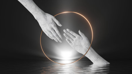 3d render, black background with white marble female hands inside the round golden frame, bright shining light and reflections in the water. Partnership concept. Modern minimal scene