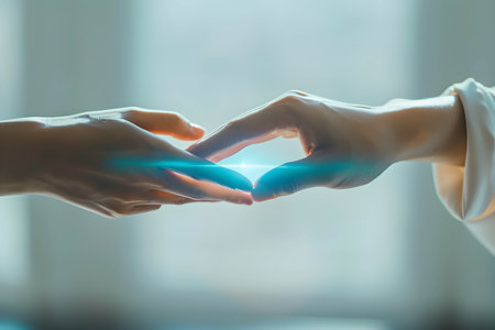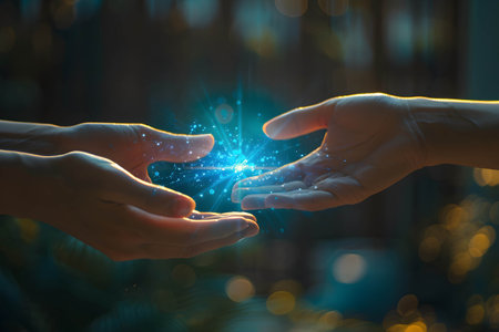 Gentle hands extend toward each other against a luminous city glow blending golden and blue tones, evoking connection, hope, and moments of tender unity at dusk.