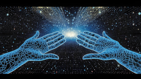 two hands touch each other with a finger, the moment of creation, the divine concept of the moment of creation.