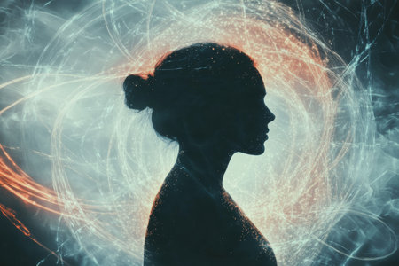 Mysterious woman with glowing eyes and swirling energy aura: spiritual enlightenment and cosmic connection