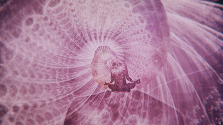 Silhouette of a yogi in a lotus asana on the background of a rotating pink background. Animation. Concept of golden ratio and self knowledge.