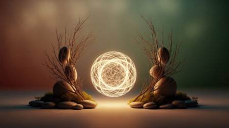An abstract composition features a central glowing sphere, framed by symmetrical organic forms. The image showcases warm, diffused lighting with a gradient background of brown and green hues. The composition may be suitable for creative projects, design elements, and artistic representations.