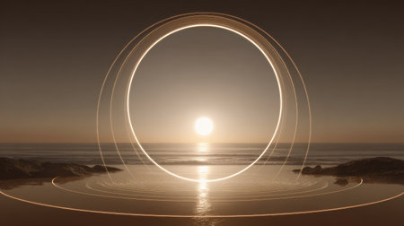 Experience a captivating sunset over a tranquil ocean, highlighted by unique circular light trails. A perfect blend of natural beauty and serene atmosphere invites reflection.