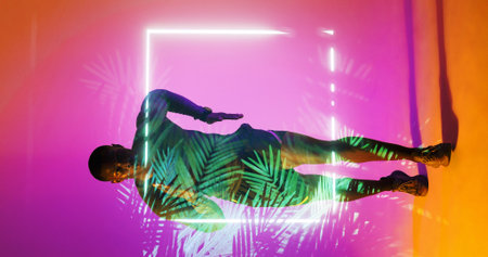Full length of african american rugby player running towards illuminated square and plants. Copy space, composite, sport, competition, shape, nature, playing, match and abstract concept.