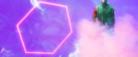 Midsection of african american basketball player in jersey standing by hexagon on smoky background. Copy space, composite, illuminated, sport, competition, illustration, shape and abstract concept.