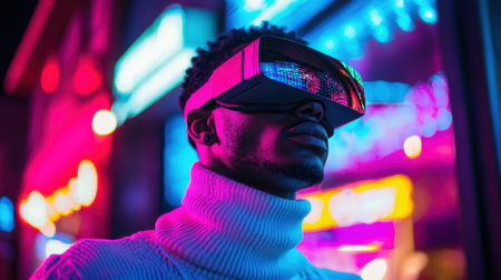 A person in a stylish turtleneck is immersed in a neon-lit environment, showcasing colorful reflections from multi-hued lights at night. The atmosphere exudes a modern, tech-inspired vibe.