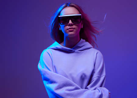 Portrait of a futuristic girl in a virtual reality headset. Future technology concept.