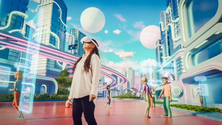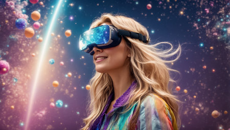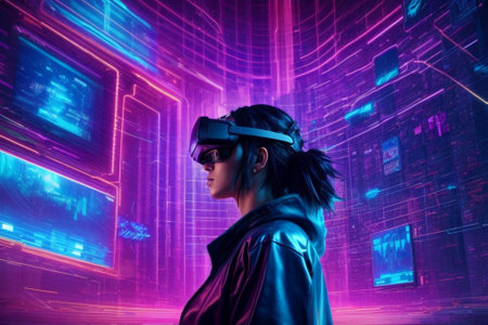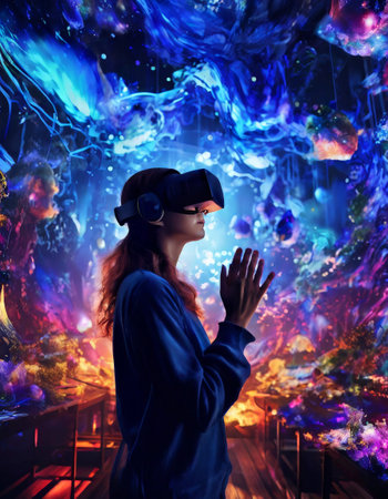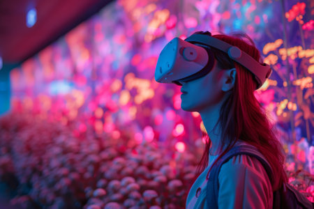 Woman exploring virtual reality in vibrant futuristic setting