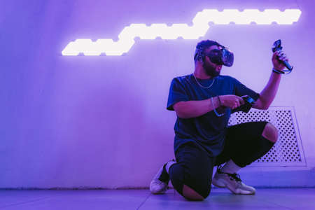 Gamer sitting with virtual reality goggles and controllers playing video games in neon light studio. VR Headset technology for entertainment experience. Metaverse visualization simulation concept