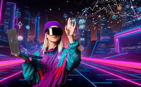 Style woman in 90s tracksuit and VR glasses and laptop on neon city background