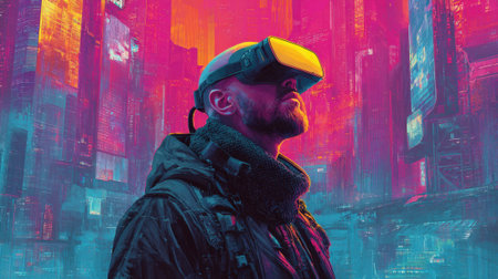 A futuristic figure wearing VR goggles and headphones stands against a vibrant pink and blue background, embodying advanced technology and virtual reality.