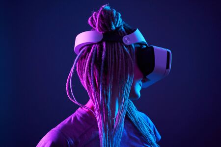 Woman is using virtual reality headset. Neon light studio portrait.