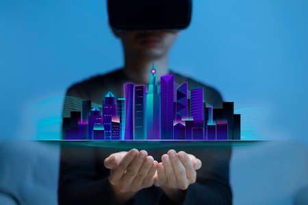Metaverse virtual reality, augmented reality technology, cityscape on hand. Man using VR glasses