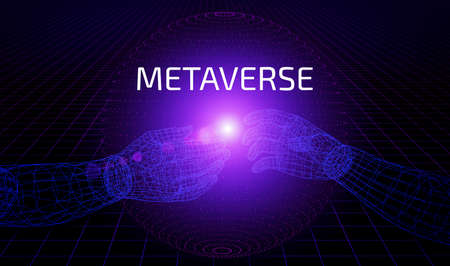 Metaverse background concept. 3D hands in virtual reality VR are connected in a big data sphere. Technology, artificial intelligence, business concept.