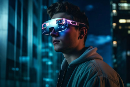 Portrait of young man wearing virtual reality glasses in city at night. Genereted AI