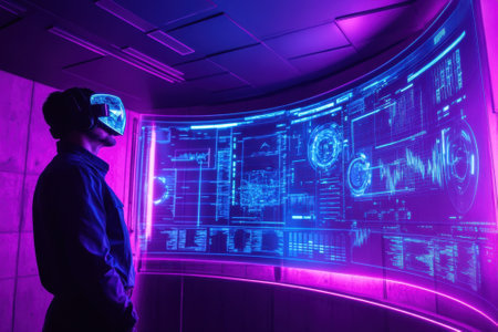 A person wearing a virtual reality headset interacts with a glowing digital display, surrounded by purple light.