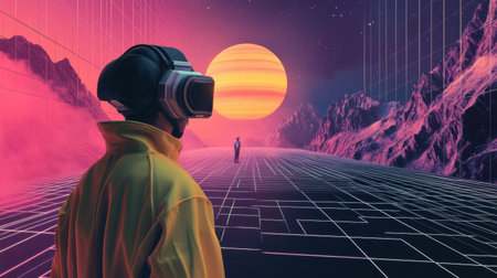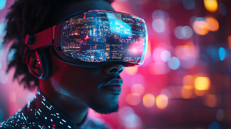 Futuristic person wearing a VR headset, immersed in virtual reality with neon lighting, subtle grain, soft focus edges, vivid background