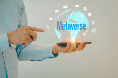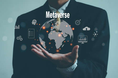 Man hand virtual world icon. Communication and use of modern Internet technology metaverse , Social Networking, online marketing, digital online. Concept technology.