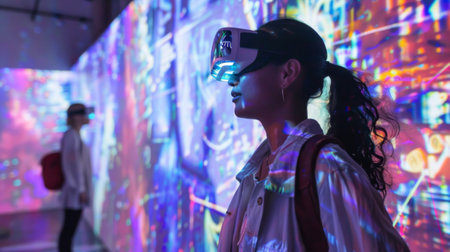 Visitors engage with interactive virtual artworks while wearing headsets in a colorful, immersive digital environment.