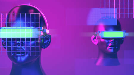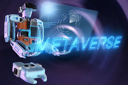 metaverse vr simulation gaming cyberpunk style, digital robot, 3d illustration rendering, virtual reality