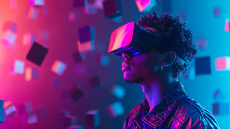 Young man with a VR headset surrounded by digital cubes, representing immersion in virtual reality, gaming, and futuristic technology. Ideal for tech and innovation.