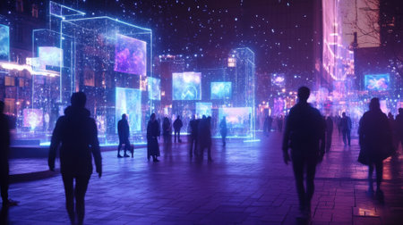 People walking in futuristic city with holographic projections and augmented reality interfaces