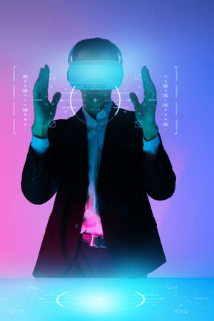 glasses of virtual reality. Augmented reality, game, future technology concept. VR simulated world of metaverse body posture futuristic dress