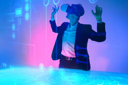 Contemporary digital business technologies. A business analyst manages business processes using virtual technologies. Digital holograms, charts.