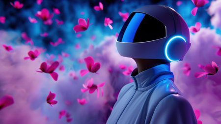 A captivating image of a futuristic person wearing a sleek helmet, immersed in a colorful dreamlike environment filled with pink flowers and clouds.