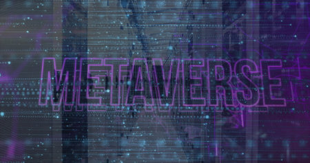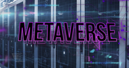 Image of metaverse text and data processing over computer servers. Global finance, business, connections, computing and data processing concept digitally generated image.