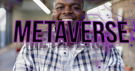 Smiling man wearing blue plaid shirt facing camera in office corridor, METAVERSE network overlay. Portrait, professional, presenter, coworking, headshot, digital, futuristic