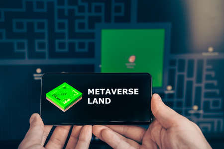 Russia Moscow 19.01.2022 Logo of Metaverse crypto game. Buy land in virtual world. Blockchain nft cryptocurrency strategy.Man playing in mobile phone for coin,token.Earning digital money.Play-to-earn.
