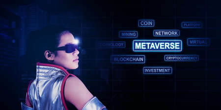 Young woman wearing futuristic glasses while looking at metaverse word on the virtual screen background