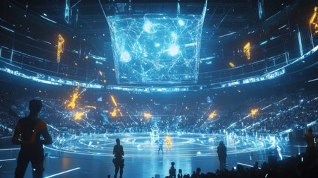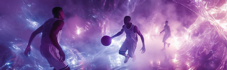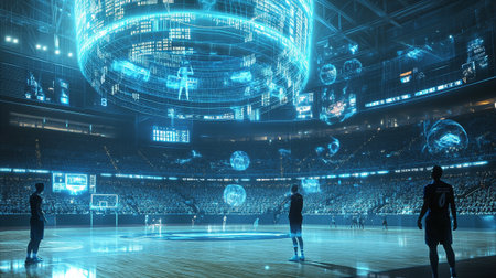 Silhouettes of basketball players against large basketball stadium 3D rendering