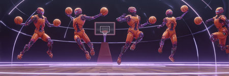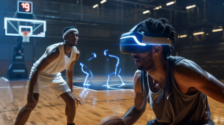 Basketball player bouncing basketball hologram at futuristic sport arena. Energetic athlete or sport person practicing basketball skill by using augmented reality technology. Innovation. Ingenuity.