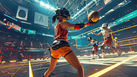 A male wearing virtual reality goggles defends against a ball thrown by a female athlete in motion.