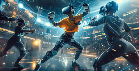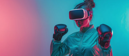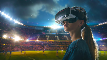 Caucasian woman using virtual reality headset in a stadium. Concept of VR technology, immersive experience, sports entertainment.