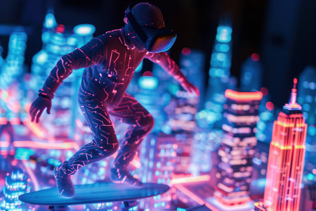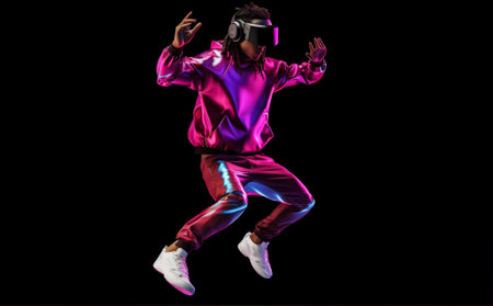 The guy is sitting in virtual reality. Neon retro style. The photo shows the effect of grain, noise.