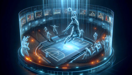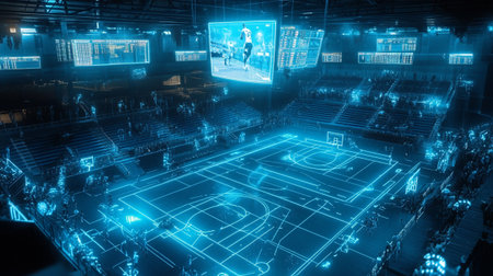 Basketball player holding basketball hologram at futuristic sport arena. Energetic athlete or sport person practicing basketball skill by using augmented reality technology. Innovation. Ingenuity.