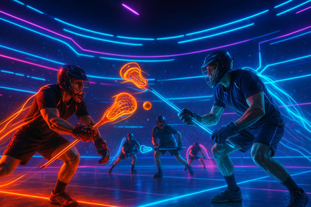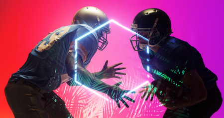 American football players wearing helmets standing face to face by illuminated hexagon and plants. Composite, copy space, sport, competition, neon, illustration, glowing, opponent, nature and match.