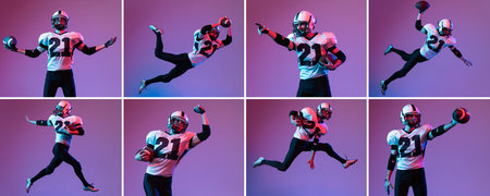 Collage. Portrait of professional american football player in motion, training isolated over purple background neon light. Concept of active life, team game, energy, sport, competition.