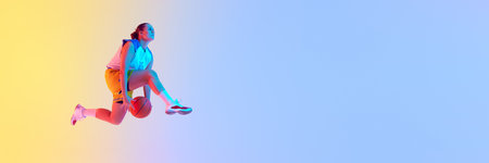 Banner. Focused on game young woman, basketball player dribbling in mid-air in neon light against gradient studio background. Concept of professional sport, championship, tournament, recreation. Ad