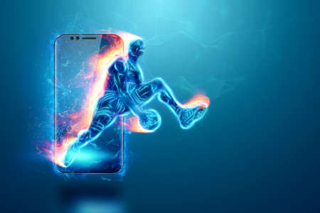 The fiery image of a basketball player cuts out of his smartphone. Creative collage, sports app. Concept for online store, online application, sports betting, 3D illustration, 3D render.