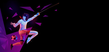 Composite image of woman wearing special equipment doing different kinds of sport, fencing, soccer over dark mode background. Dueling