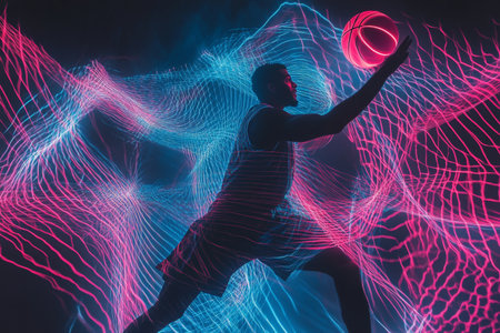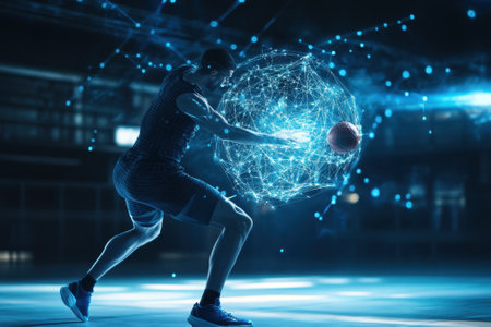 An athlete in motion interacts with a glowing digital sphere while practicing basketball indoors.