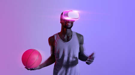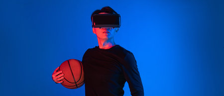 Asian athlete with VR holding a basketball player exploring virtual space on neon portrait sports training connecting digital futuristic hologram technology metaverse world playing court. Contrivance.