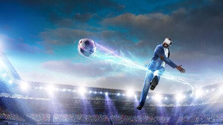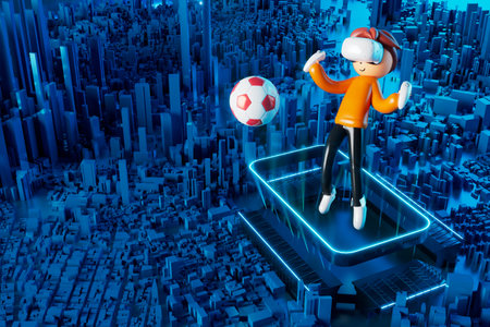 3d boy cartoon character within football action and VR glasses metaverse. 3d illustration. ball object rendering. fitness exercise workout. copy space background. kick action. competition game