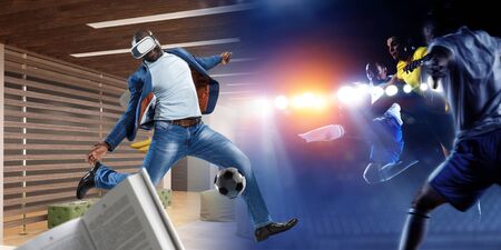 Virtual Reality headset on a black male playing soccer. Mixed media