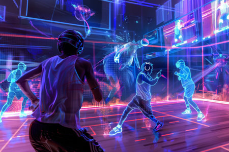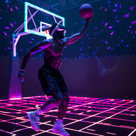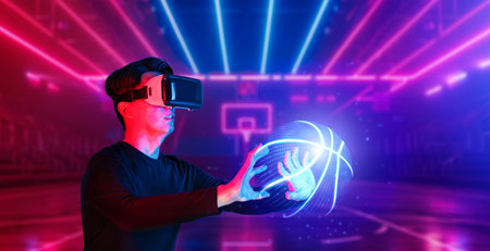 Caucasian sport person playing basketball at neon sport stadium while wearing casual cloth and virtual reality glasses. Athlete holding basketball hologram while standing at sport arena. Deviation.