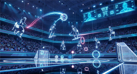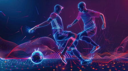 Standing two men wearing jerseys facing off in studio, holding ball with digital dot projection. Athletes, competition, modern, vibrancy, teamwork, fitness, digital art